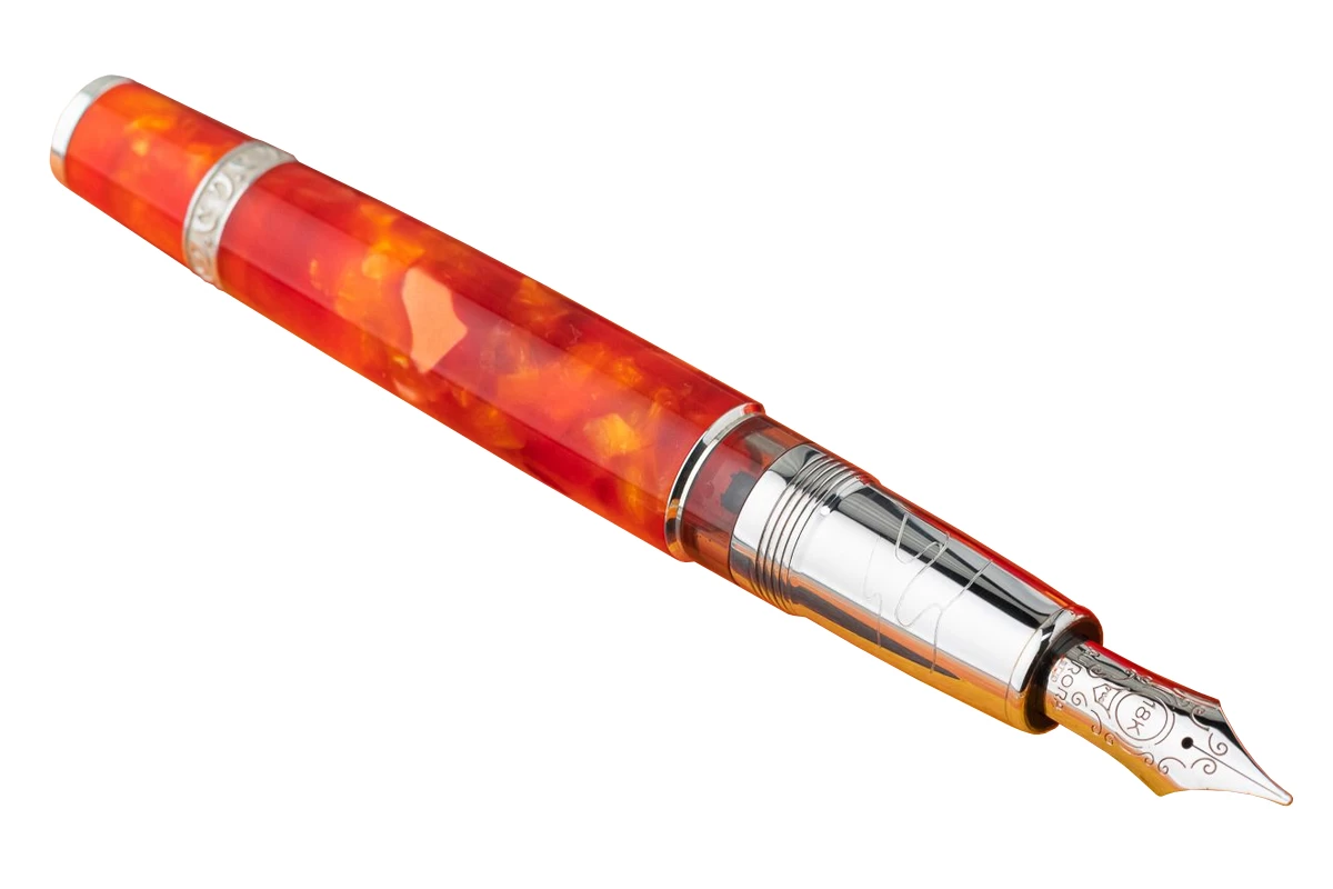 Wat betreft het materiaal van de vulpen, de accenten zijn gemaakt van hoogwaardig sterling zilver en de penpunt is gemaakt van 18kt goud. Daarnaast bevat de pen een pistonvulsysteem.