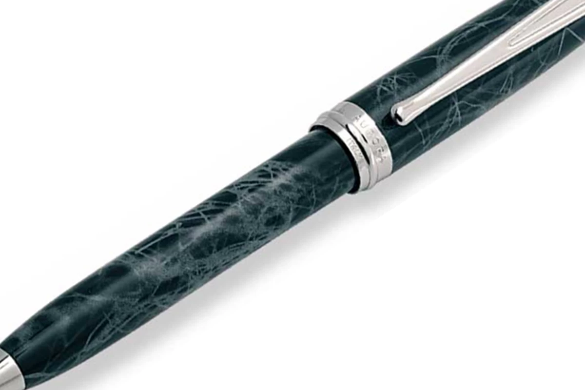 De balpen heeft een houder van grijs hars met chroom plated zilveren randen. Het oppervlak van de pen bevat een verfijnd gemarmerd patroon om het iconische Lacca-ontwerp te reflecteren.