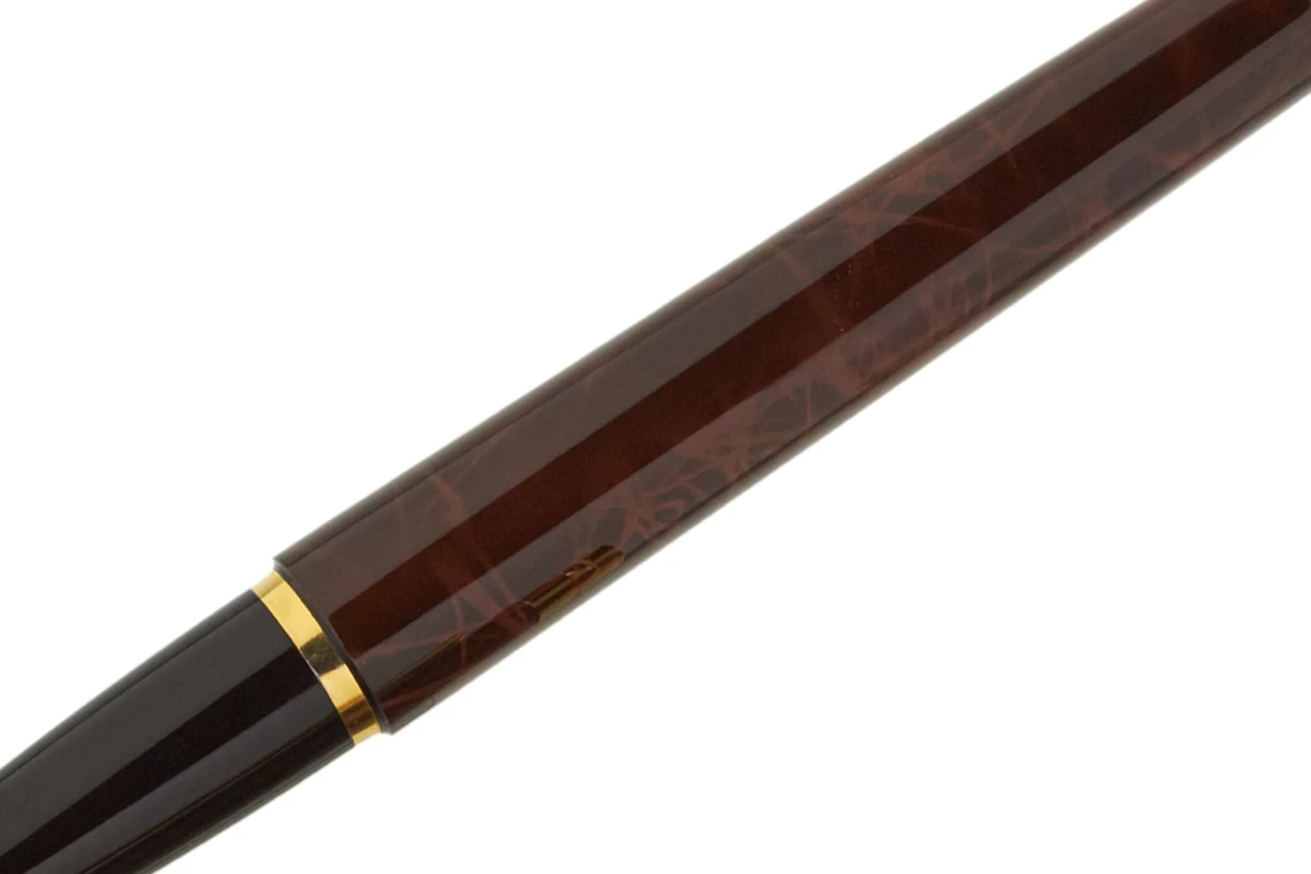 Het schrijfinstrument heeft een houder van bruin hars met verchroomde gouden versieringen. Het oppervlak van de pen bevat een delicaat gemarmerd patroon wat het iconische Lacca ontwerp reflecteert.