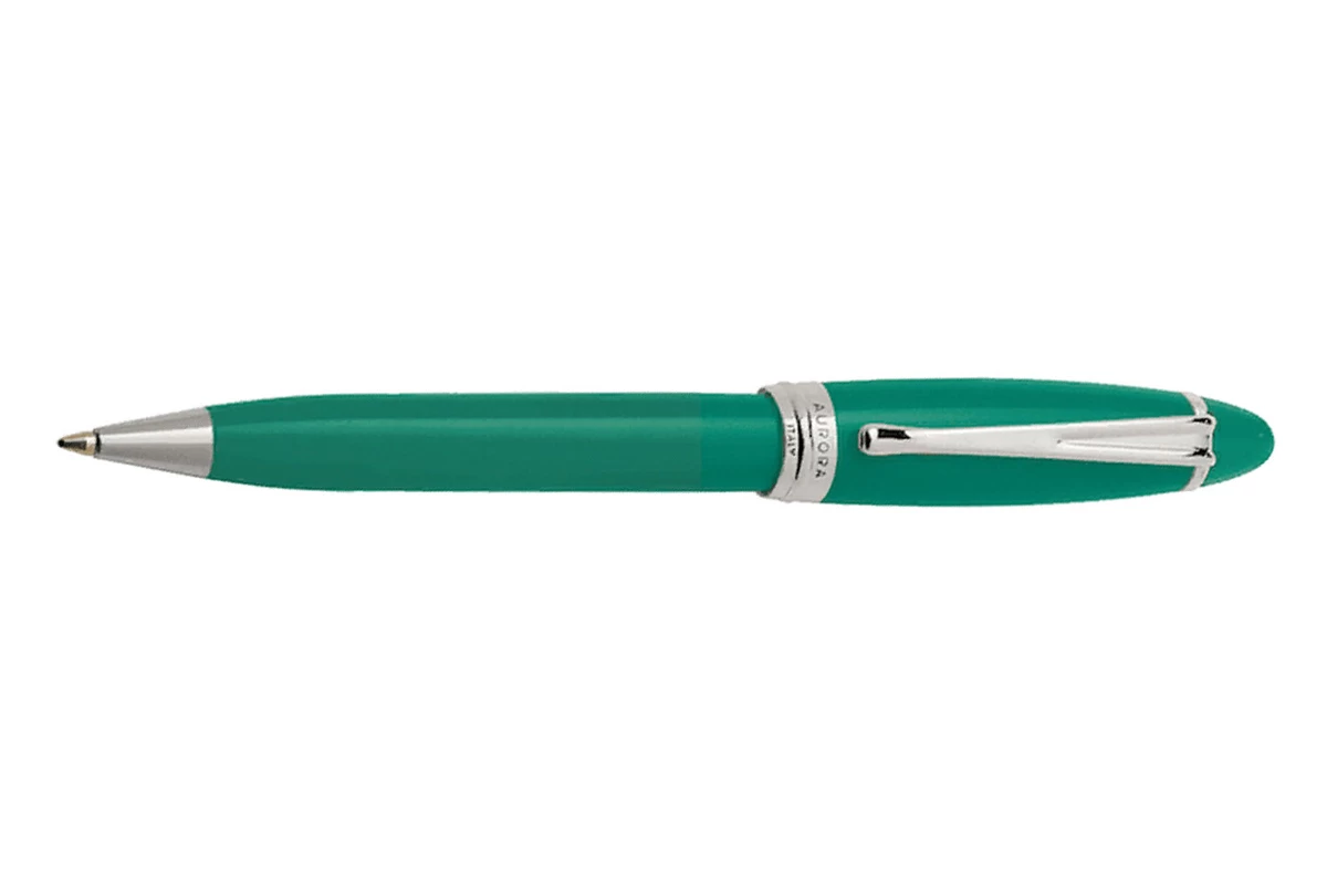 De Aurora Ipsilon balpen heeft een lichaam van hars met groene lak en zilverkleurige accenten.