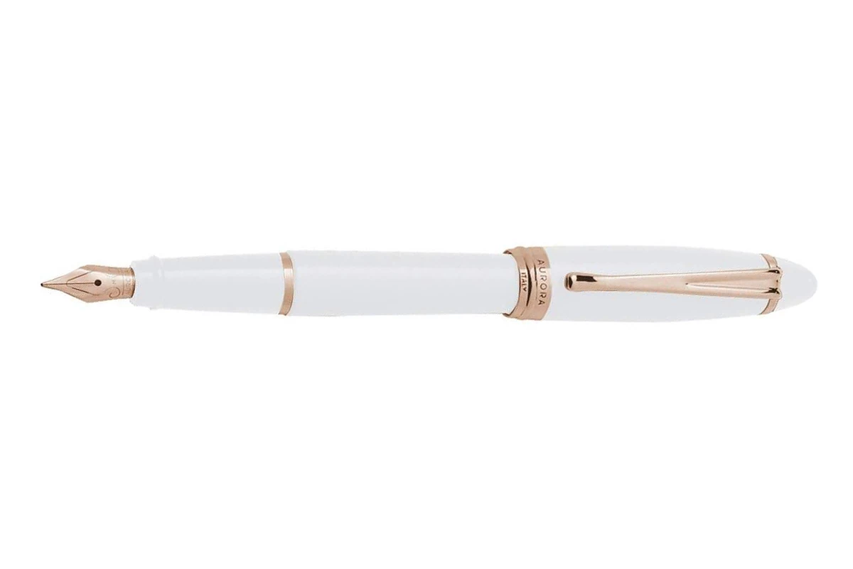 De Aurora Ipsilon vulpen heeft een houder van hars met witte lak en goudgecoate randen. De punt is van roestvrij staal.