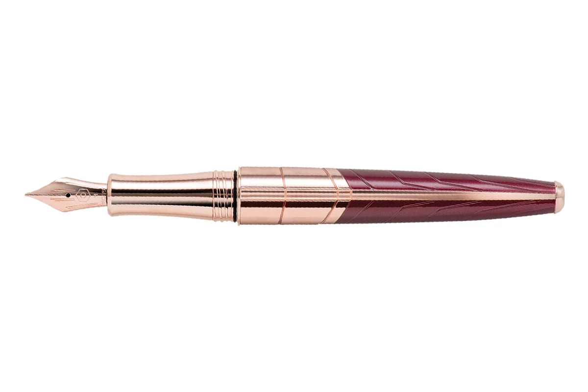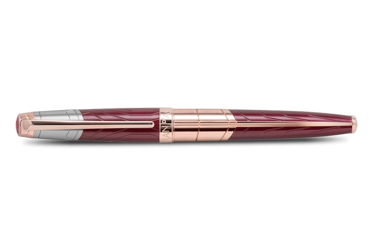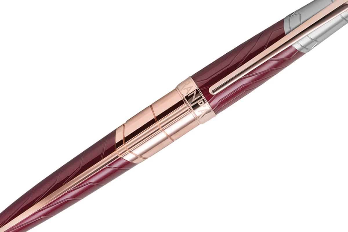 Wat de materiële kenmerken betreft is een ultraprecieze gravure aangebracht op het schrijfinstrument en is het bedekt met een doorschijnende bordeauxrode satijnen lak om de bustier van Wonder Woman weer te geven. De punt van de dop van het schrijfinstrument een ruwe, zilveren afwerking, geïnspireerd door de armbanden van Wonder Woman. De pen is afgewerkt met een 18-karaats massief gouden penpunt, gecoat met roségouden plating voor uitstekende vloeibaarheid.