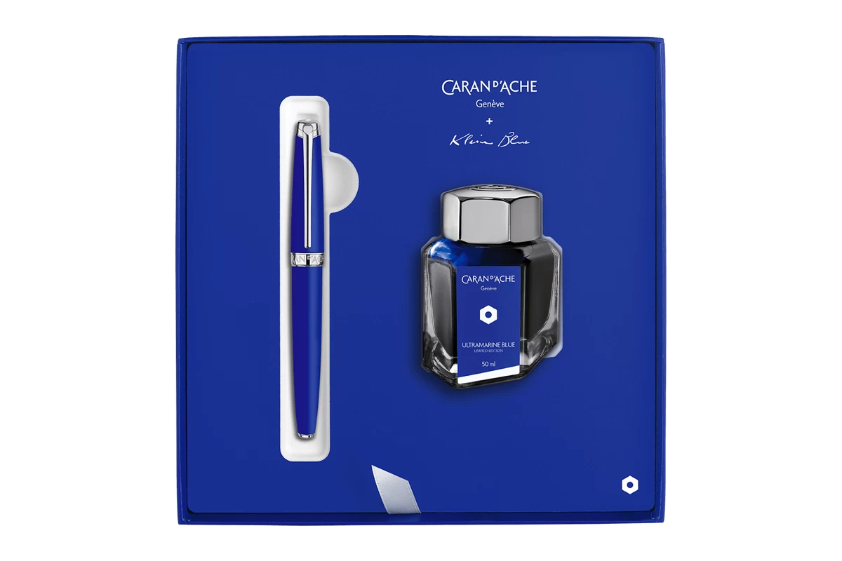 De pen wordt geleverd met een ultramarine inktpotje van Caran d’Ache.