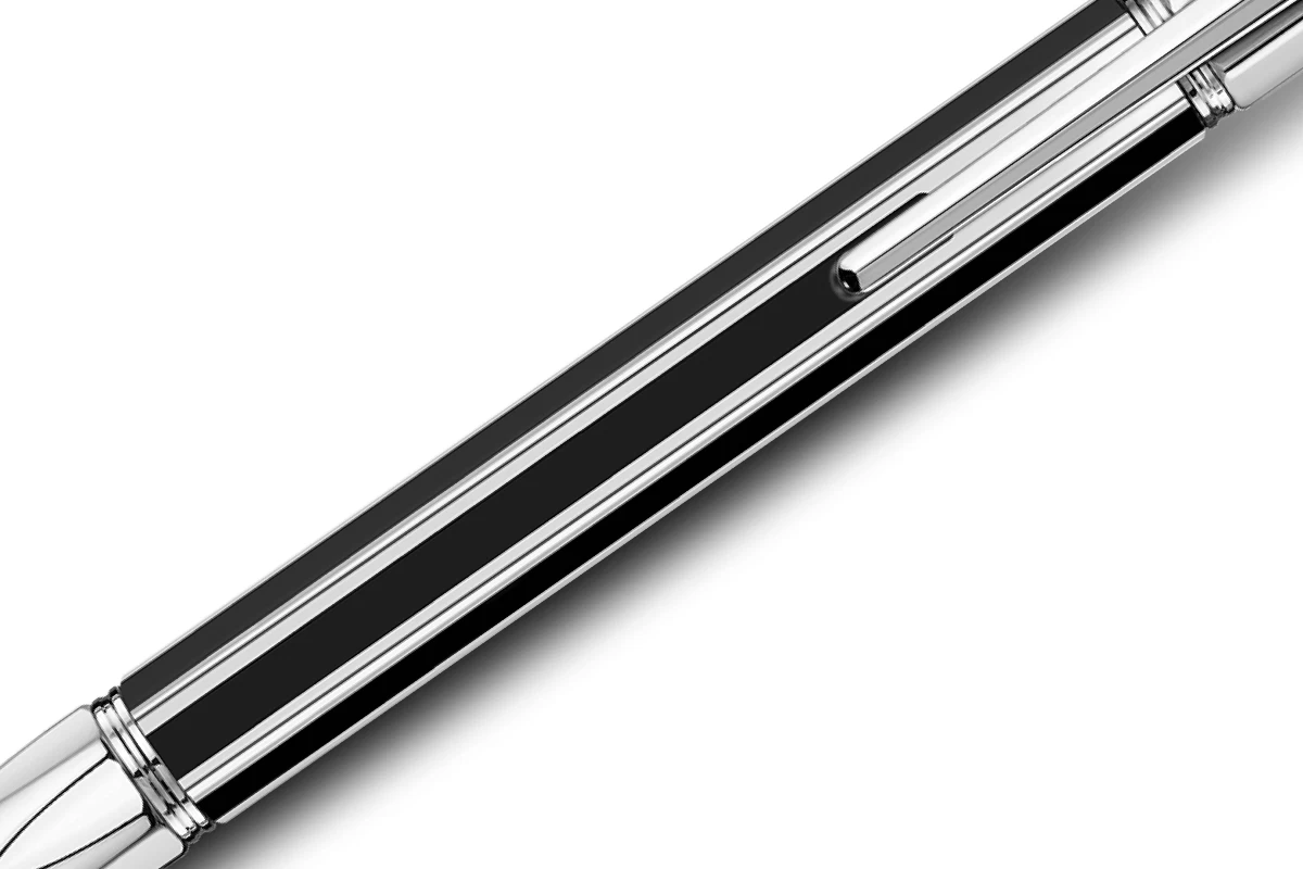 Het materiaal past prachtig bij de verzilverde, gerhodineerde, afwerking van de pen.