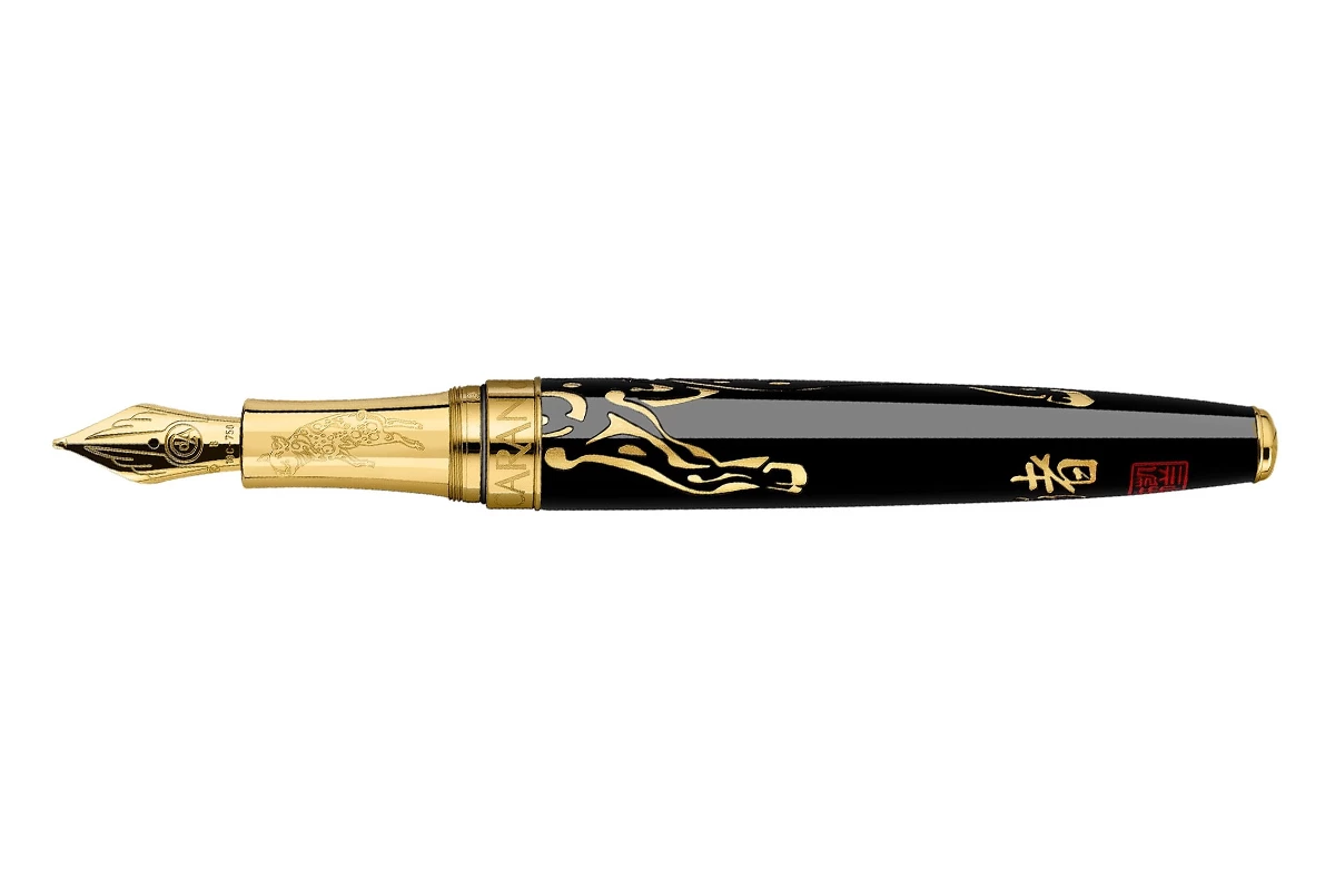 Het Caran d’Ache schrijfinstrument is voorzien van een 18 karaats gouden penpunt. De barrel is vervaardigd uit Chinese Lak, een eeuwenoude techniek, ontwikkeld tijdens het regeren van het Shang dynastie. De afwerkingen zijn verguld .