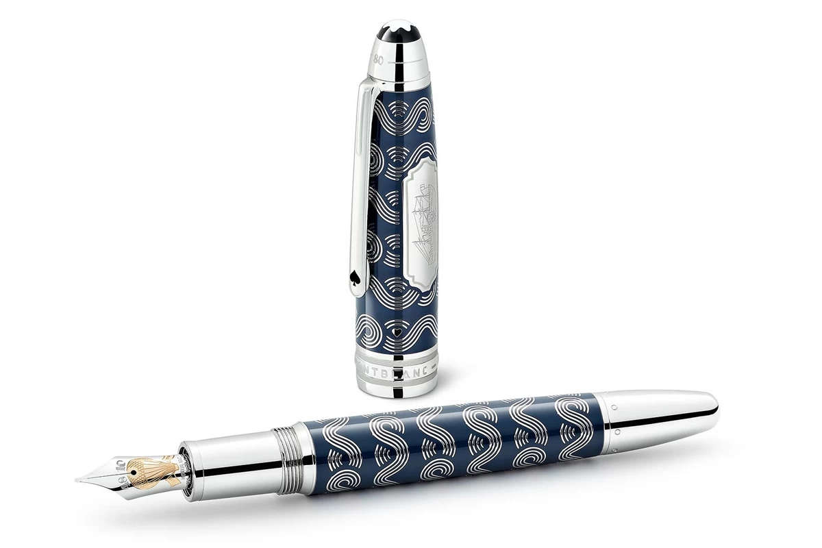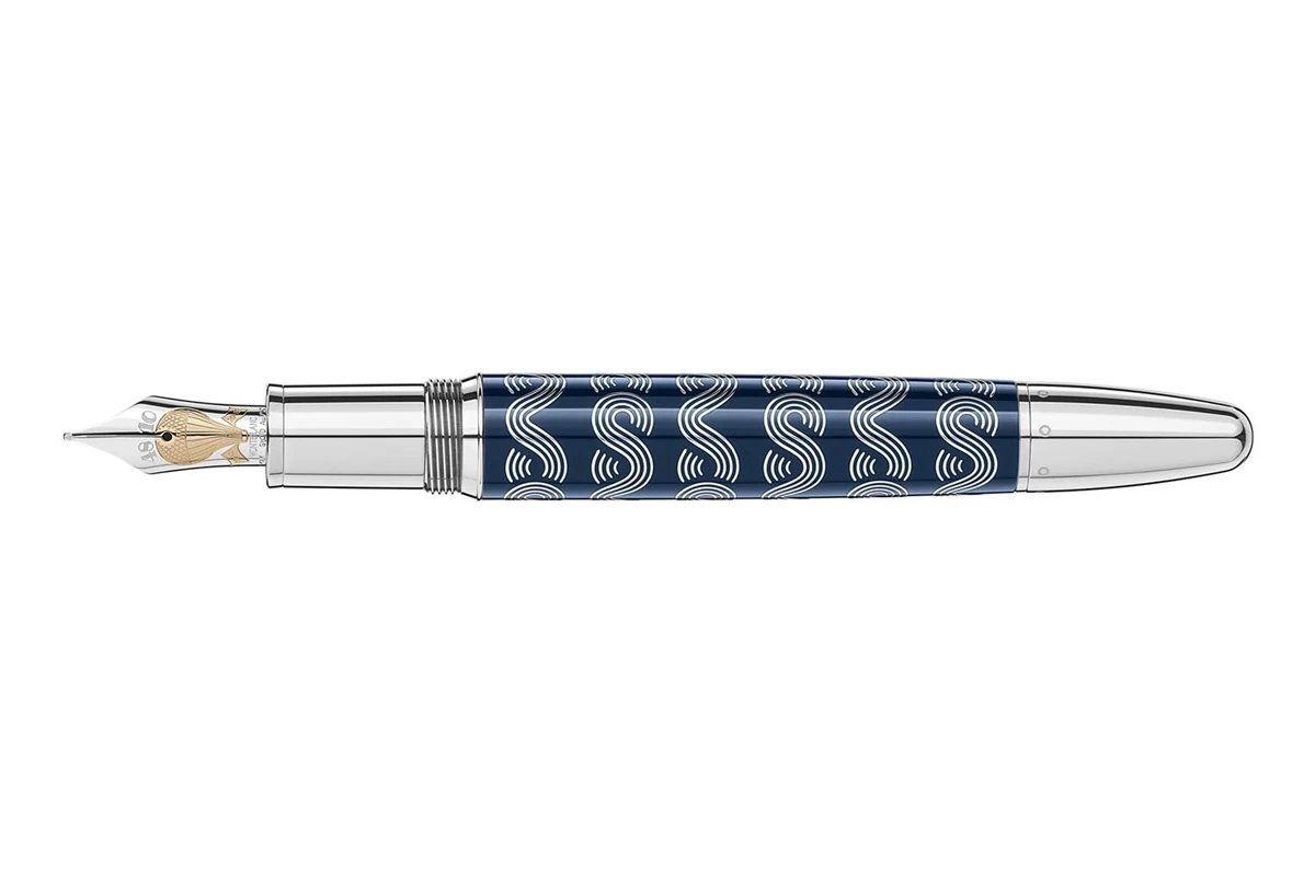 Verder vertegenwoordigen de lasergegraveerde stoomboot en golven op de pen de oversteek van zeeën tijdens het eerste deel van de reis. Wat betreft de penpunt, de heteluchtballon toont Verne’s algehele fascinatie voor reizen en is ook een symbool dat reflecteert op zijn andere roman “5 Weeks in a Balloon”. Ten slotte is de kleur Indigo Blue het resultaat van het mengen van London Purple met Middellandse Zeeblauw, een briljante manier om Verne’s verhaal in een schrijfinstrument te vertalen.