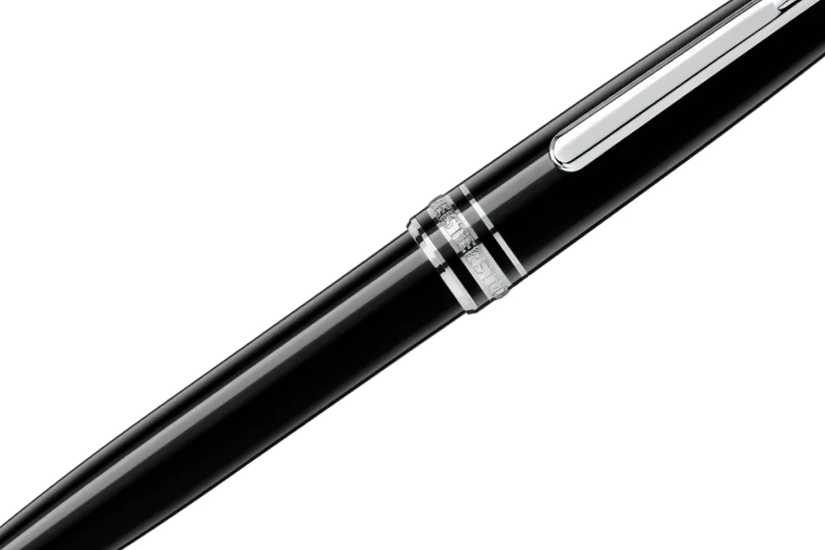 De dop en houder zijn gemaakt van zwart edelhars met het iconische witte Montblanc embleem in de dop. Dit materiaal behoudt zijn kleur en is bovendien krasbestendig, zodat het schrijfinstrument zijn glans behoudt. De pen is afgewerkt met platina accenten.