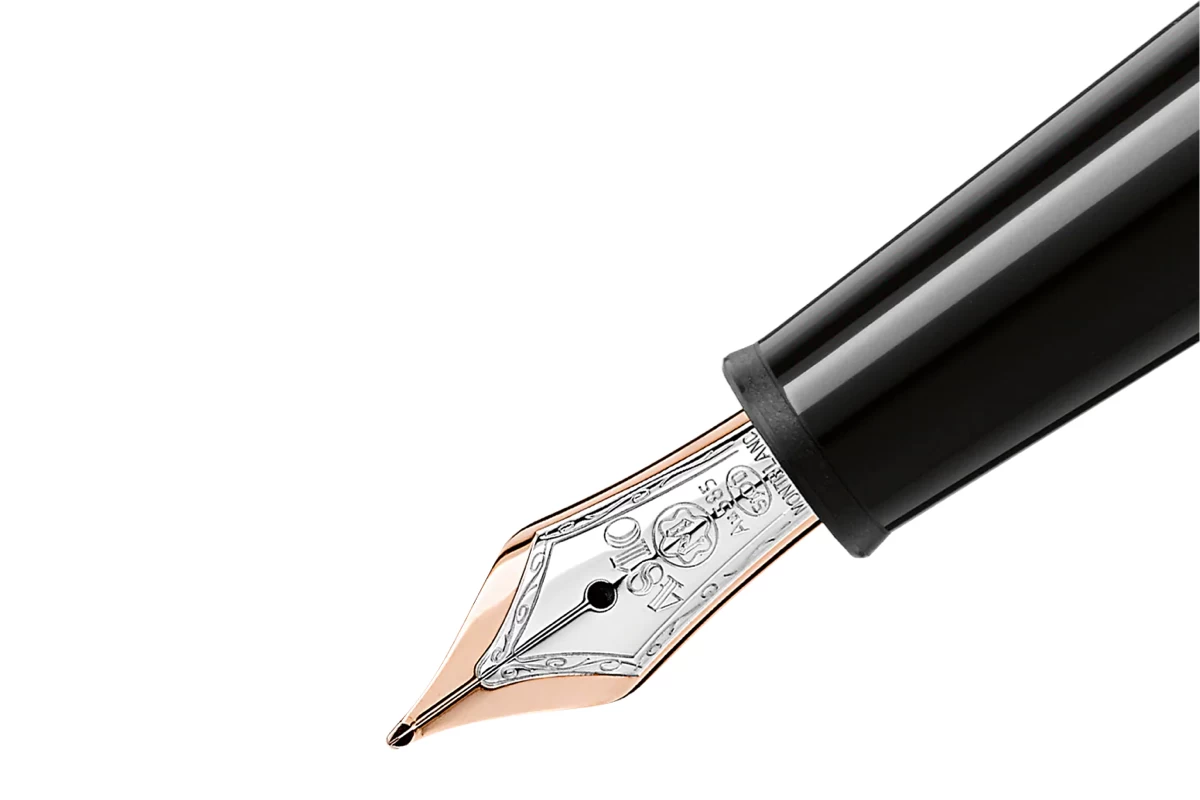 De dop en de houder zijn gemaakt van zwart edelhars met het iconische witte Montblanc embleem in de dop. Dit materiaal behoudt zijn kleur en is bovendien krasbestendig, zodat het schrijfinstrument zijn glans behoudt. De pen is afgewerkt met rosé gouden accenten.