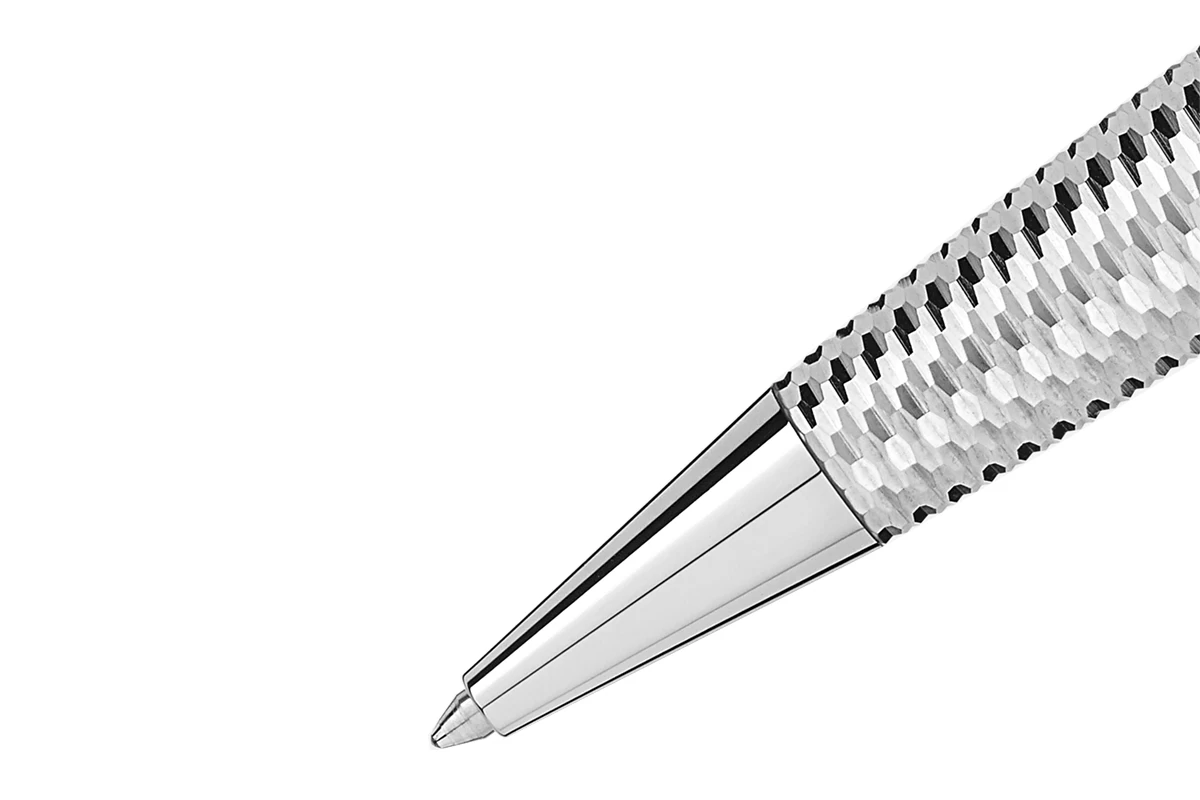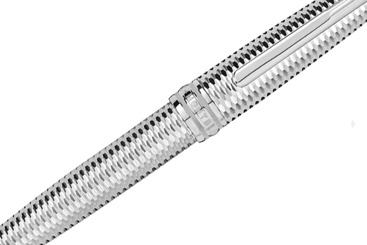 Het lichaam van het schrijfinstrument is geplatineerd en diep gegraveerd met een geometrisch motief, dat een optisch effect creëert en er bij iedere lichtval anders uitziet. Op de bovenkant van de dop bevindt zich het karakteristieke logo van Montblanc.