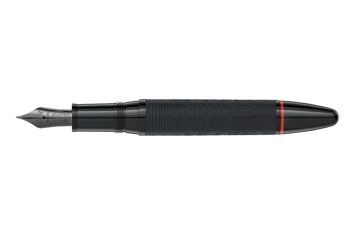 De dop is bekroond met het Montblanc-logo in parelmoer, gezet in onyx en een gelakte ring in het iconische Pirelli-rood.