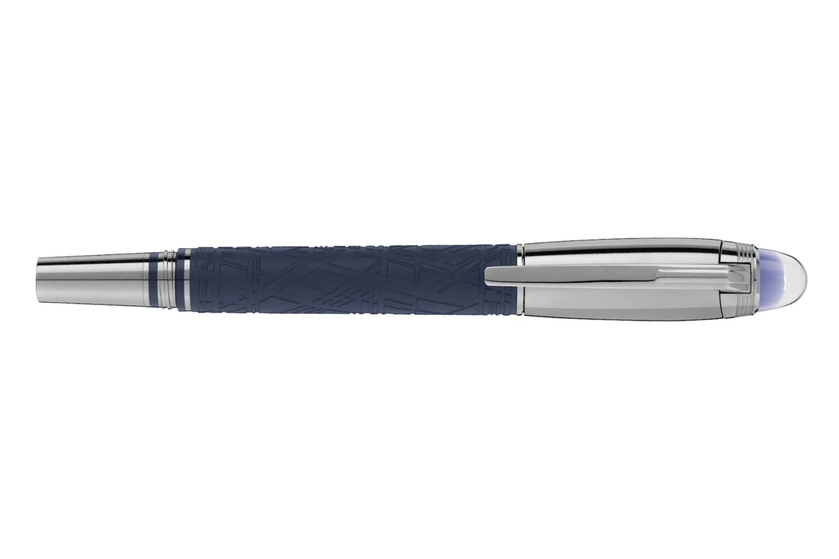 Uiterst mannelijk en futuristisch, brengt deze nieuwe StarWalker collectie een nieuwe look voor de dop en barrel van hars, met een ontwerp dat doet denken aan de ingewikkelde structuren van het Widmanstätten patroon, een van de meest hypnotiserende creaties van de natuur. De metalen dop en het details zijn gecoat in donker ruthenium, samen met een diepe ruimteblauwe tint voor het matte edelhars, die doet denken aan de tinten van een sterrenhemel. Ook de halve koepel op de dop, waarin het Montblanc embleem zweeft, komt in een diepe ruimteblauwe kleur.