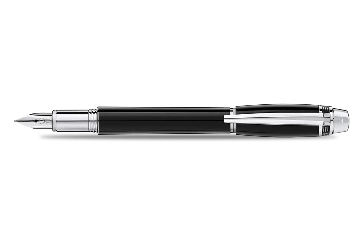 Het schrijfinstrument is gemaakt van zwart hars en afgewerkt met een handgemaakte 14 karaats gouden penpunt.