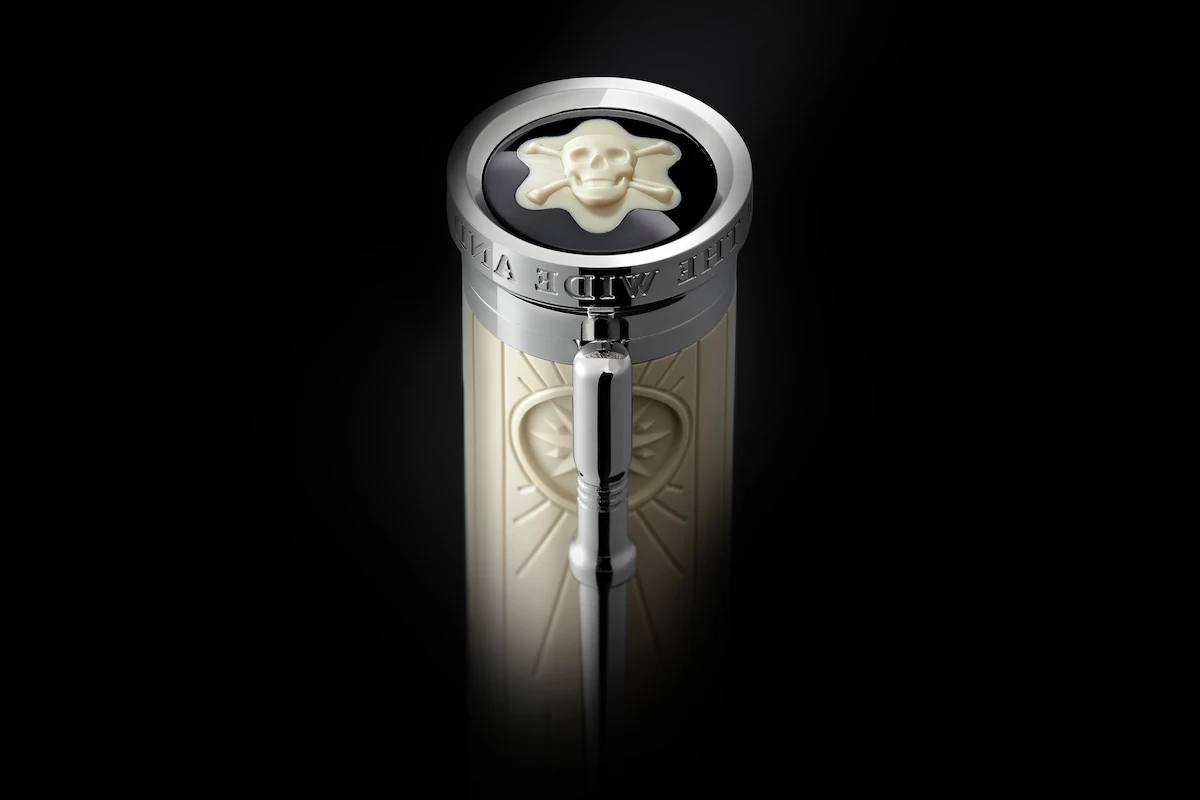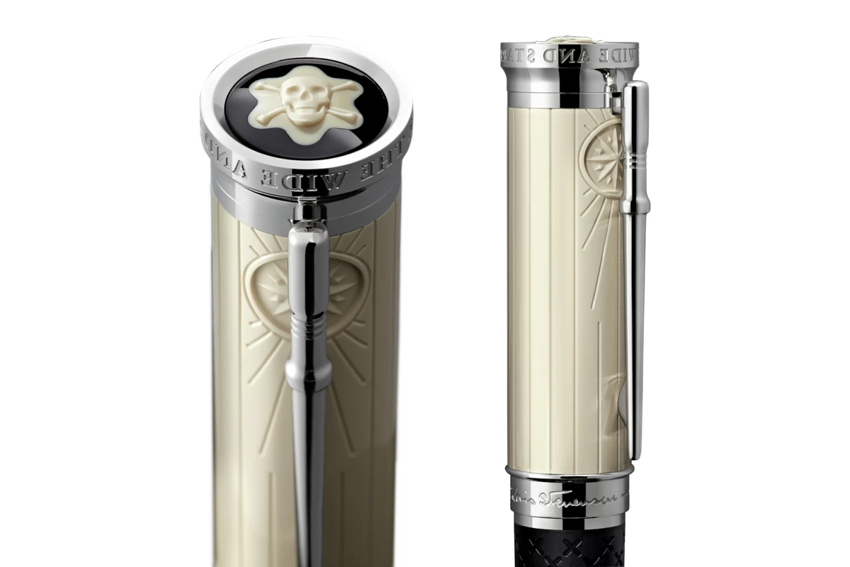 De zwarte barrel van edelhars is versierd met gegraveerde kruisen, waaronder een grotere “X” zoals die welke de locatie van de schat op een kaart markeert. Verticale lijnen die doen denken aan de planken van de schoener “Hispaniola” en een traditionele zeekist sieren de dop van de Writers Edition. Achter de met platina beklede clip komen de lijnen samen in een kompasroos, terwijl de clip de vorm nabootst van een belaying pin, waaraan de lijnen van de tuigage van een schip zouden worden vastgemaakt. De dop wordt bekroond door het Montblanc embleem met in het midden het symbool van de piraat, een schedel en gekruiste botten. De ring van de dop is versierd met een gravure van Stevensons handtekening en de publicatiedatum van zijn eerste werk “The Pentland Rising”, 1886. De levensjaren van Robert Louis Stevenson, 1850-1894, zijn op de dop gegraveerd.