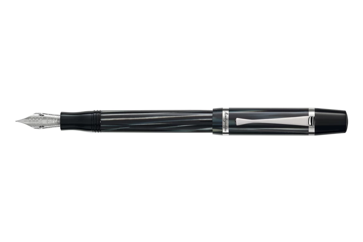 “Nazionale” is een modelnaam die vanaf de late jaren dertig deel uitmaakte van de Elmo-catalogus. Het ademt de art-decohouding, de kleuren roepen het tijdperk op met prachtige tinten en schakeringen. Montegrappa heeft besloten om de Montegrappa Nazionale een nieuw leven in te blazen met een belangrijke functie die acht decennia geleden nog niet beschikbaar was. Nazionale keert terug, visueel volledig trouw aan de originele stijl, het instrument wordt met beperkte oplage geproduceerd in zwart en wit celluloid, precies zoals het was in de jaren 1930. Het ontwerp van de pen is verrijkt met zwarte harsdetails op de kruispunten en de blinde dop, het materiaal is de superieure moderne vervanger voor eboniet, gemaakt zonder de juiste “look” op te offeren. Trim is noodzakelijkerwijs in Sterling Zilver. De middelste metalen ring is verder gegraveerd met het merklogo, terwijl de zakclip eindigt met een decoratief traanelement, wat het vintage gevoel vergroot.