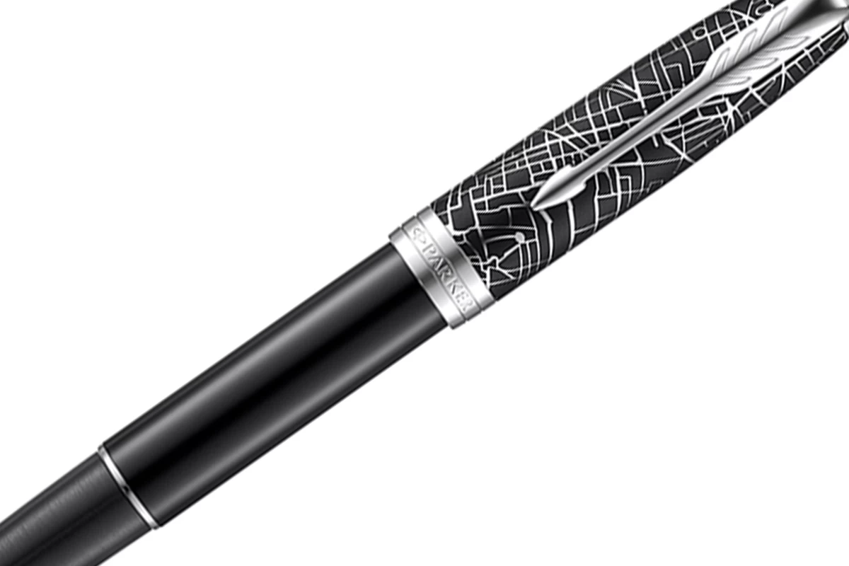 De vulpen met zwart en zilver ook wel “metro” genoemd is geinispireerd op delen van de kaart van de metro in Parijs.