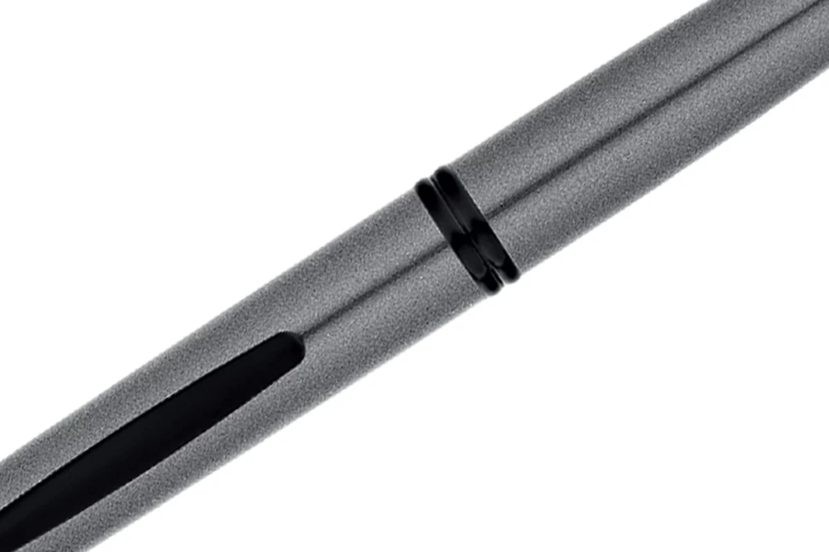 Deze pen beschikt over een grijs lichaam met zwarte details voor een moderne uitstraling.