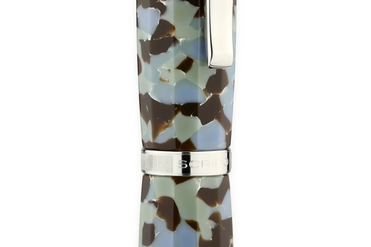 Grijze, blauwe, bruine en groene tinten kenmerken de kleuren van dit materiaal en geven samen met de platina randen leven aan de Scribo FEEL Granigilia.