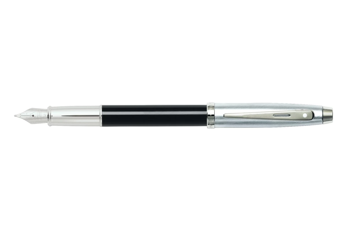 Deze mooie Sheaffer 100 vulpen heeft een zwart gelakt lichaam en een chromen dop, welke beiden zijn afgewerkt met chromen finishes. De vulpen is verkrijgbaar met medium penpunt.