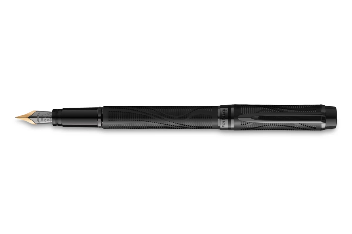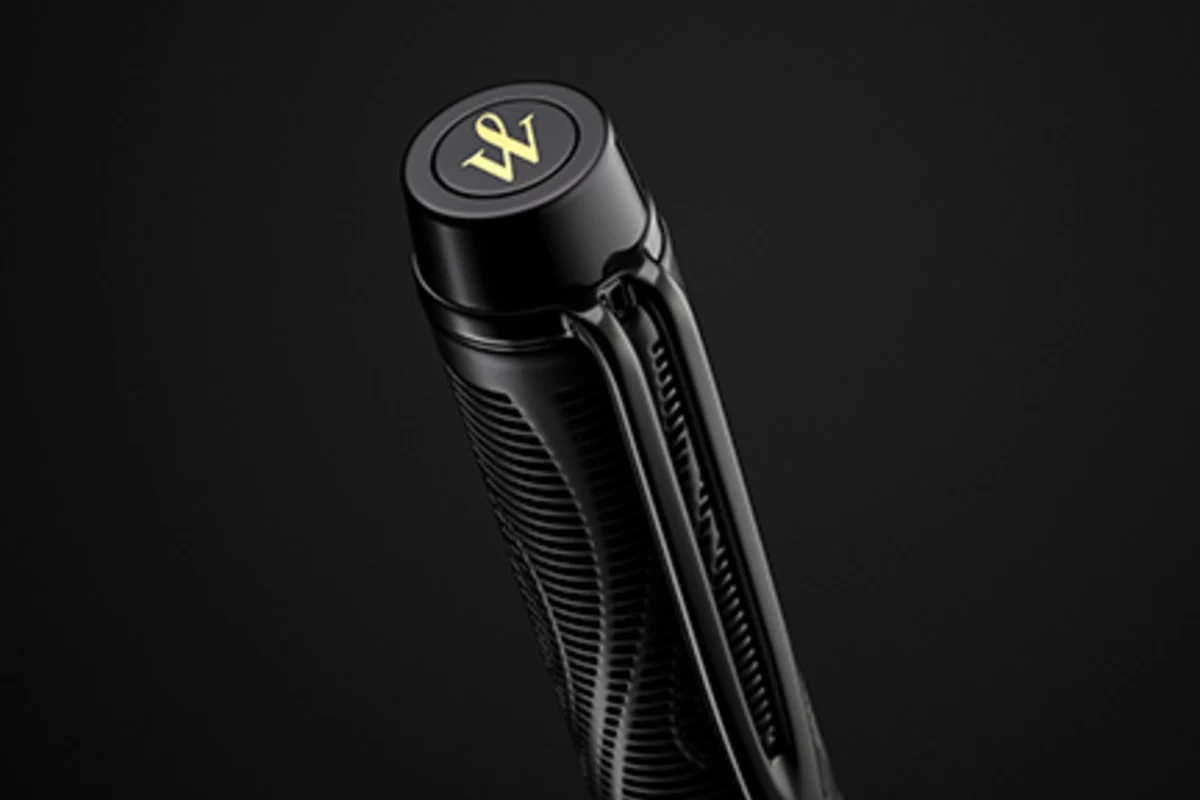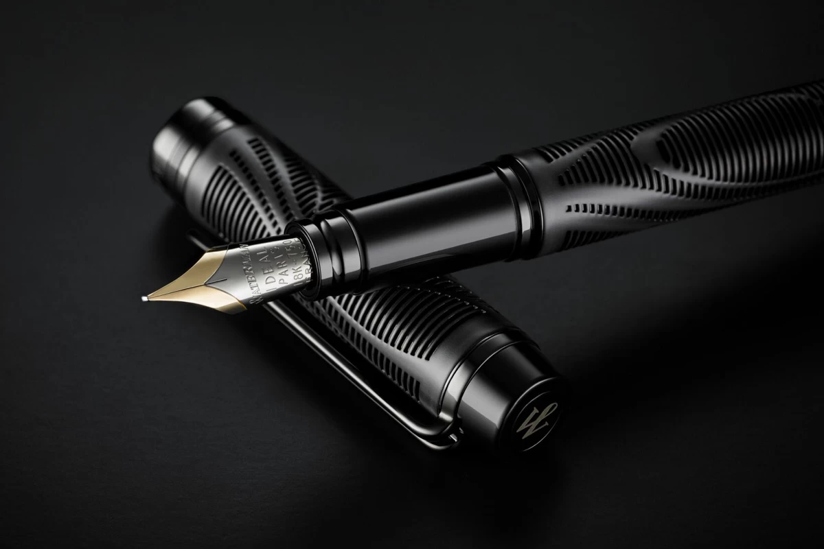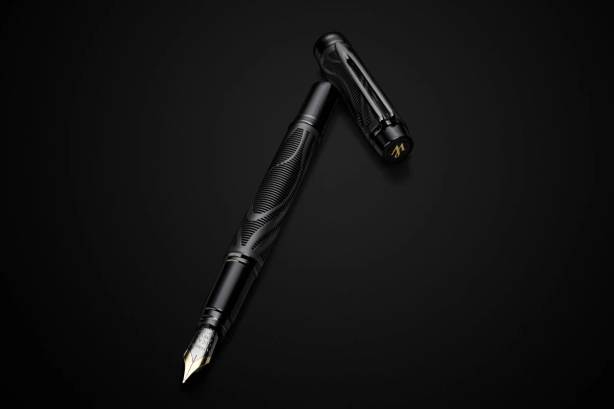 De pen is uitgevoerd in een monochrome, matzwarte coating en is gecombineerd met een 18-karaats gouden duotone penpunt (goud en ruthenium).